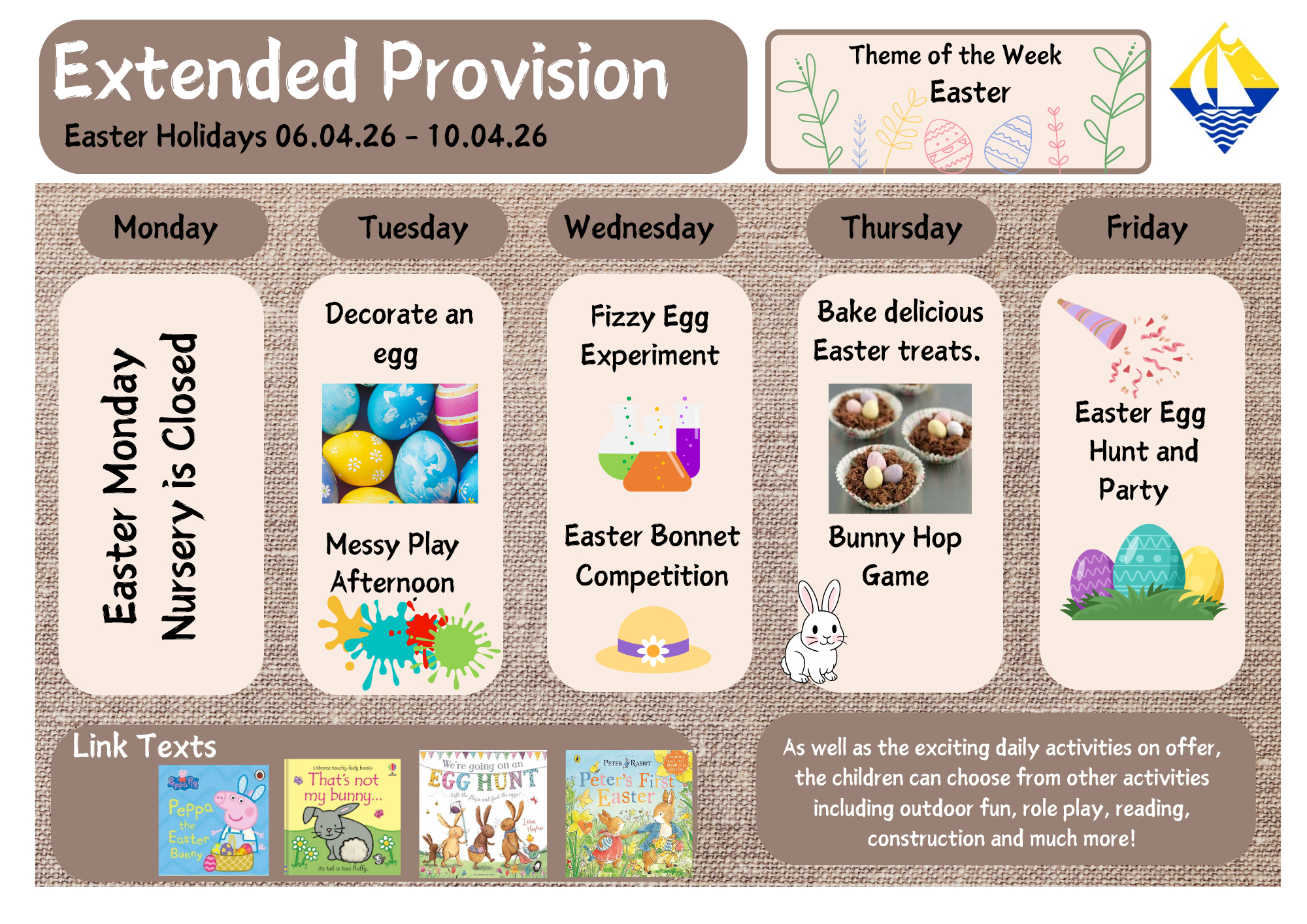 During non-term time, Extended Provision offers a relaxed but well-planned programme of activities, allowing children to enjoy a different pace from the usual nursery routine while still benefiting from meaningful play and learning experiences. Our approach ensures that children remain happy, settled and engaged, with opportunities to explore their interests and build friendships across the provision.